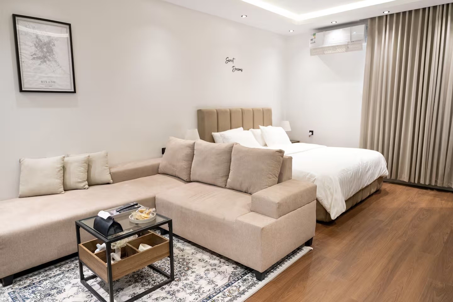 استمتع بإقامة مريحة وفاخرة في قلب الرياض. استمتع بسرير ملكي فاخر، أريكة مريحة، وتلفزيون سامسونج ذكي 55 بوصة مع اشتراك نتفلكس وأكثر.مجهز لتلبية جميع احتياجاتك سواء للعمل، الدراسة، أو الاسترخاء التام